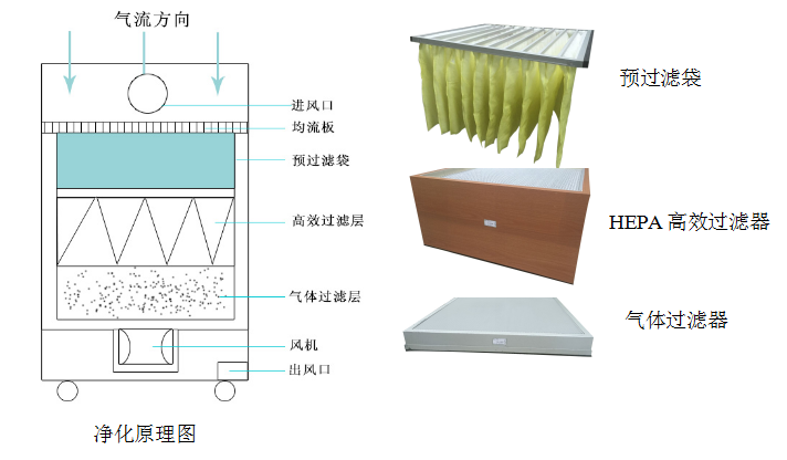 煙塵廢氣通過吸煙管/吸煙口進入凈化機內,首先經過均流板導流,使煙塵廢氣均勻通過過濾層,確保濾芯每一部分都得到有效利用。 預過濾層對煙塵廢氣中較大的污染粒子進行有效攔截,延長主過濾器的使用壽命。主過濾層對煙塵廢氣中直徑為0.3微米以上的顆粒的過濾效率達到99.99%以上。 氣體過濾層選用浸漬型活性炭加分子篩及氧化劑做吸附劑,能對煙塵廢氣中有害的化學性氣體進行有效的吸附。